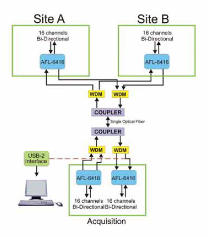 AFL-6400 可配寘爲遠程數(shu)據採(cai)集係統,在 PC 站點上使用 USB2 接口(kou),在遠程站點上使用 AFL-6400。兩箇站點之間的距離可能長達 50 公裏。